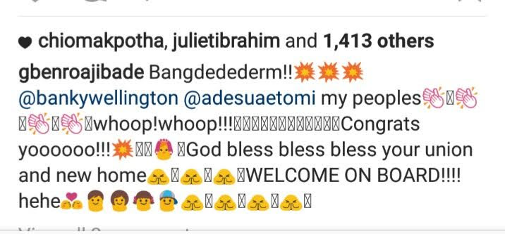 Several Nigerian entertainers have flooded Instagram with congratulatory messages to the latest celebrity couple, Banky W and Adesua Etomi. See after the cut….