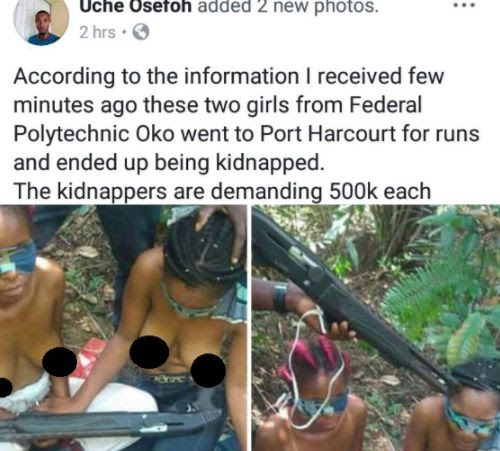 I wonder why guys are going this extreme all because of money. According Uche Osefoh who posted the photos on Facebook, the girls pictured were kidnapped in Port Harcourt, and the kidnappers have posted photos of them without their shirts, demanding N500,000 ransom each.