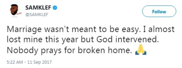 Popular music producer and singer, Samklef has refused to fall victim to the ugly trend of divorce. He took to his Twitter handle to acknowledge God’s intervention in what would have been one of the latest casualties of celebrity marriages. His words: